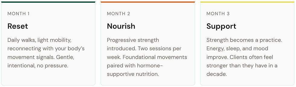 I teach strength and movement inside through the lens of Intuitive Movement — not punishment, not boot camps, not 90-minute workouts that leave you exhausted and guilty. Movement should be something your body recognizes as support, not stress. Here is how the program structures this month by month: