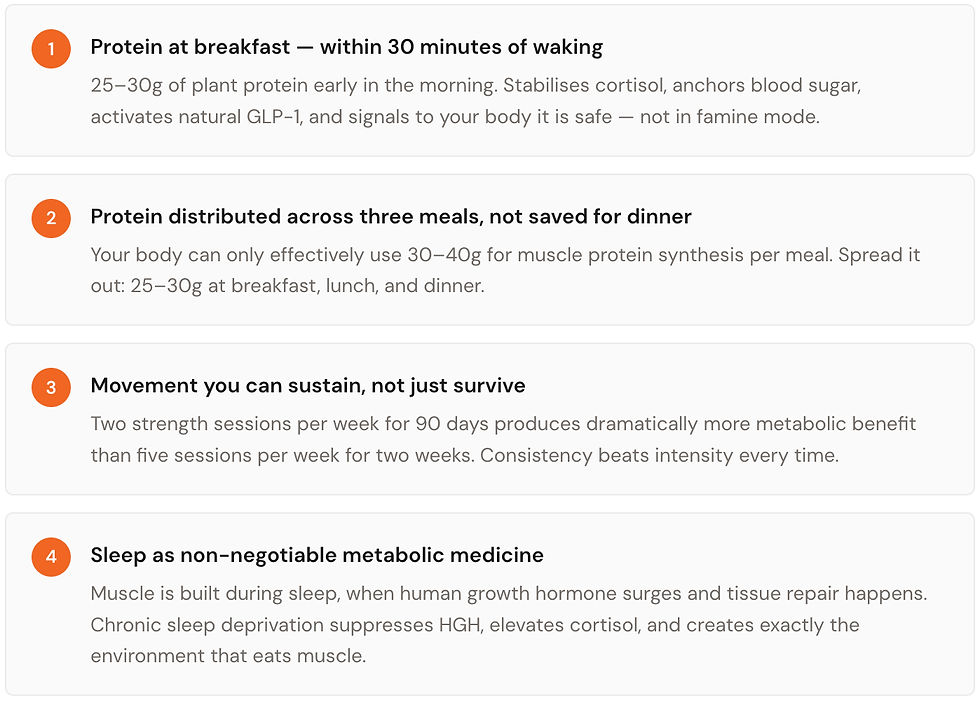 Protein without resistance training is like having all the building materials for a house and no architect. The research is clear: combining adequate protein with structured strength work is the only evidence-based intervention that simultaneously reduces fat and builds or preserves muscle.
