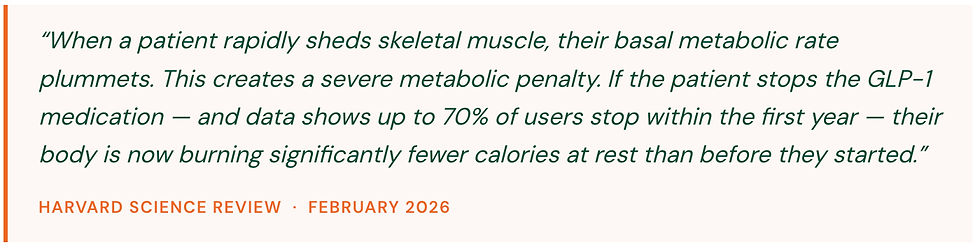 This is the mechanism behind the weight regain that affects 75–90% of GLP-1 drug users. The drug never repaired the underlying system. It overrode it. When the override stops, everything that was broken reasserts itself — now with less muscle and a slower metabolism than before.